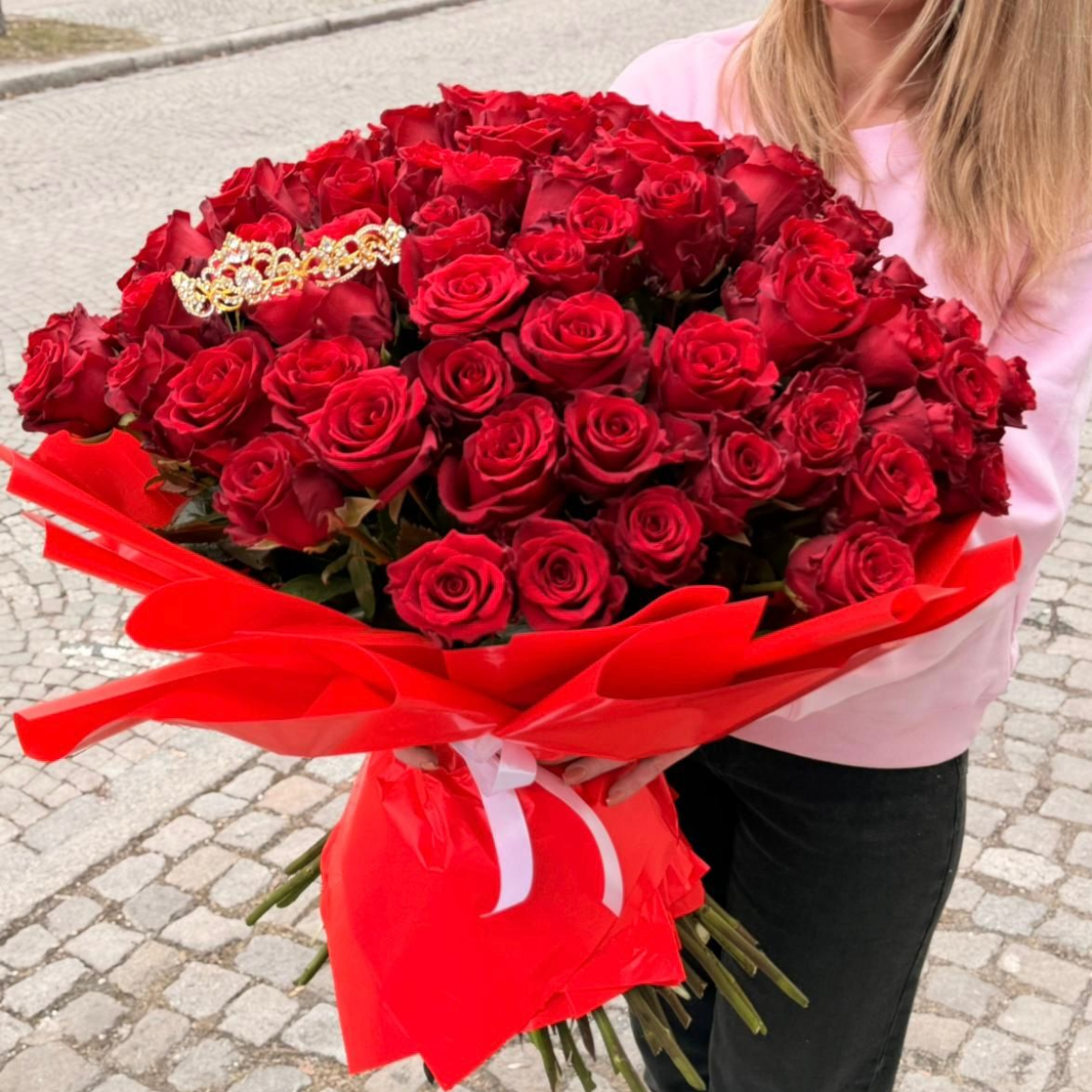 Bukiet „100 Róż” to spektakularna i ponadczasowa kompozycja, która mówi więcej niż tysiąc słów. Sto starannie dobranych, świeżych róż tworzy imponującą całość, emanującą luksusem, miłością i elegancją. Każdy kwiat zachwyca aksamitnymi płatkami i intensywną barwą, a całość podkreślona jest soczystą zielenią liści, dodającą bukietowi świeżości i harmonii. To idealny wybór na wyjątkowe okazje – rocznice, zaręczyny, jubileusze czy romantyczne wyznanie uczuć. „100 Róż” to gest pełen emocji, który na długo pozostanie w pamięci i zrobi niezapomniane wrażenie.